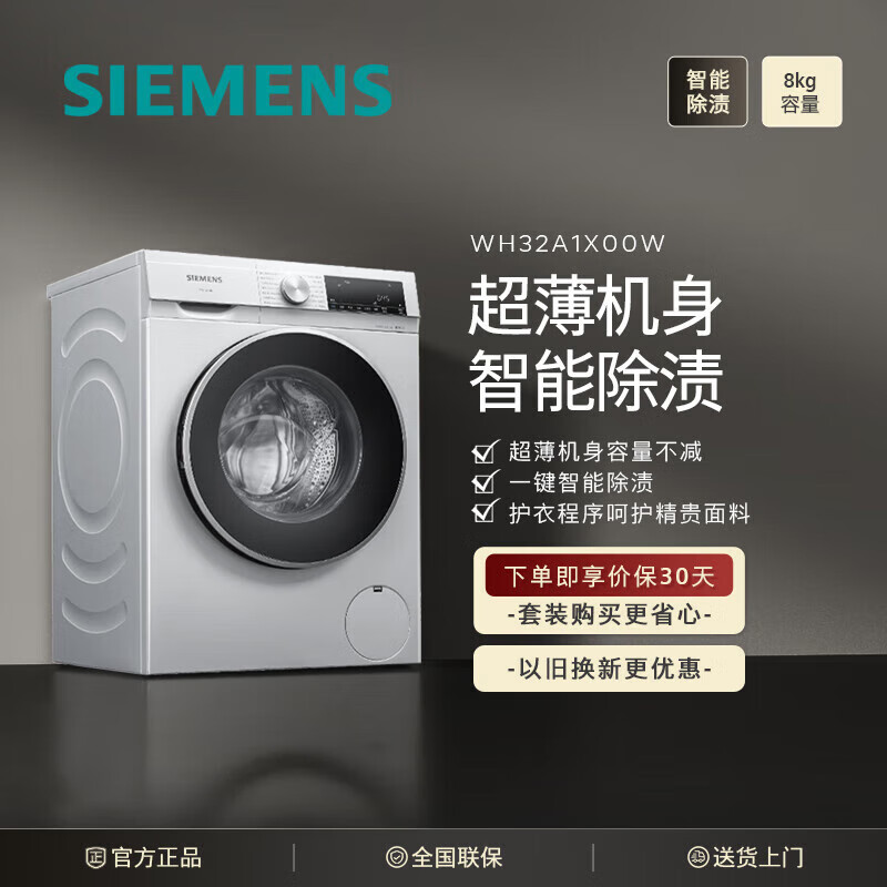 西门子(SIEMENS) 8公斤超薄滚筒小洗衣机全自动 496mm超薄机身 智能除污渍 专业羽绒洗XQG80-WH32A1X00W价格:5299.00元!