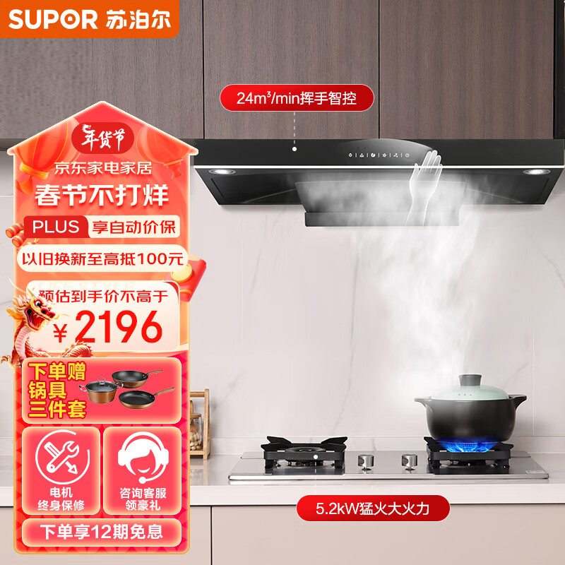 苏泊尔(SUPOR)抽油烟机燃气灶套装 欧式烟灶套装 24立方变频风压挥手智旋干洗吸油烟机DT39+DS37天然气价格:2396.00元!
