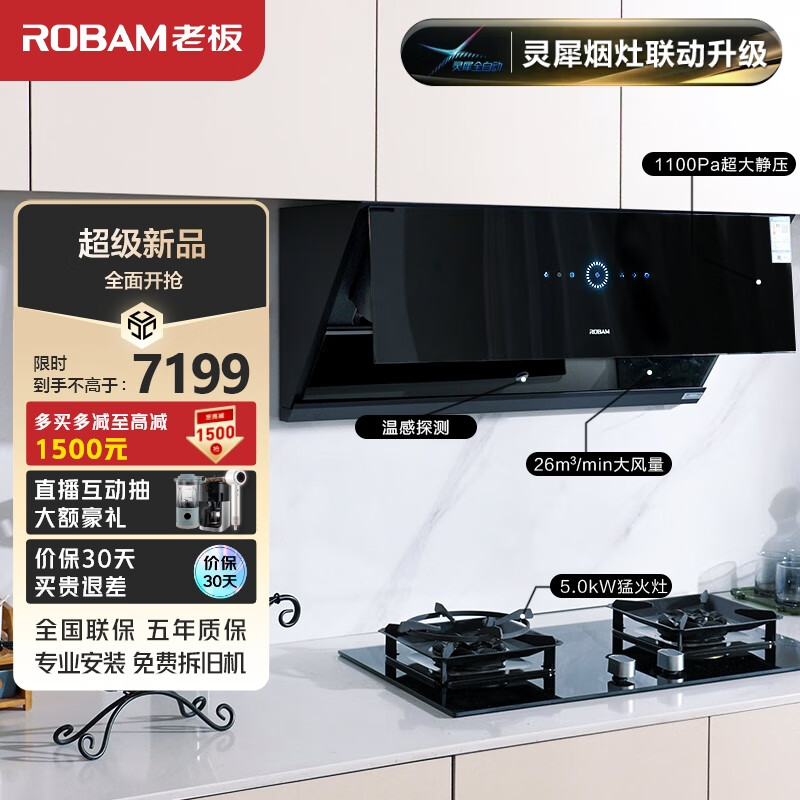 老板(Robam)抽油烟机智能变频灵犀全自动控烟家用侧吸26风量吸烟机燃气灶具烟灶套装29A9S+57B6D套装(液化气)价格:7199.00元!