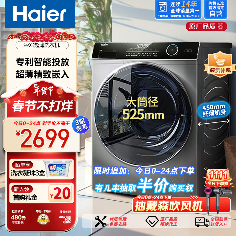 海尔(Haier)9KG全自动超薄滚筒洗衣机 大容量纤薄嵌入速洗巴氏除菌智能投放双淋喷洗衣机 大筒径 以旧换新价格:2699.00元!