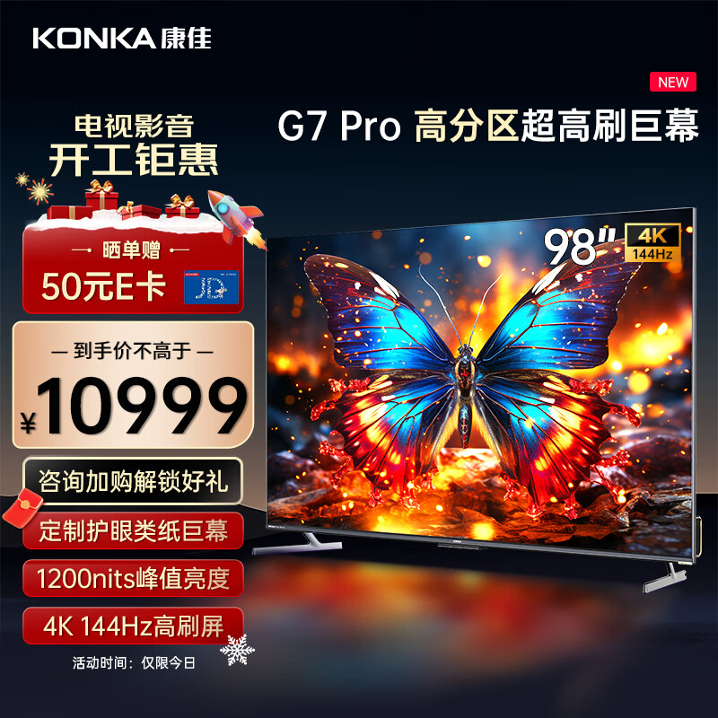 康佳电视 98G7 PRO 98英寸 百级分区144Hz游戏电视 4+64GB 4K超清巨幕智能液晶平板电视机100 以旧换新价格:10999.00元!