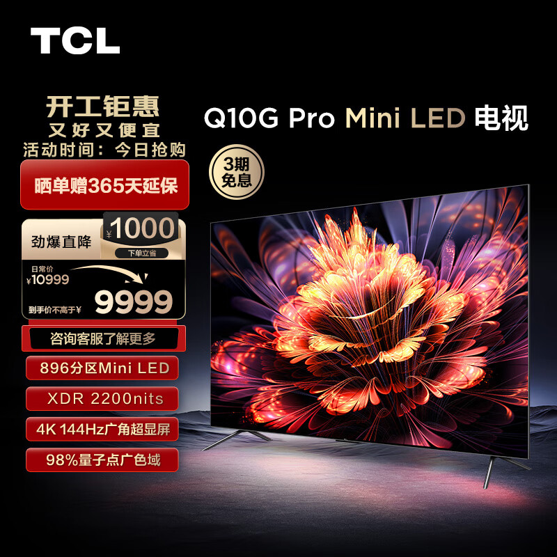 TCL电视 85Q10G Pro 85英寸 Mini LED 896分区 2200nits 4K 144Hz 2.1声道音响 液晶智能平板电视机价格:9999.00元!
