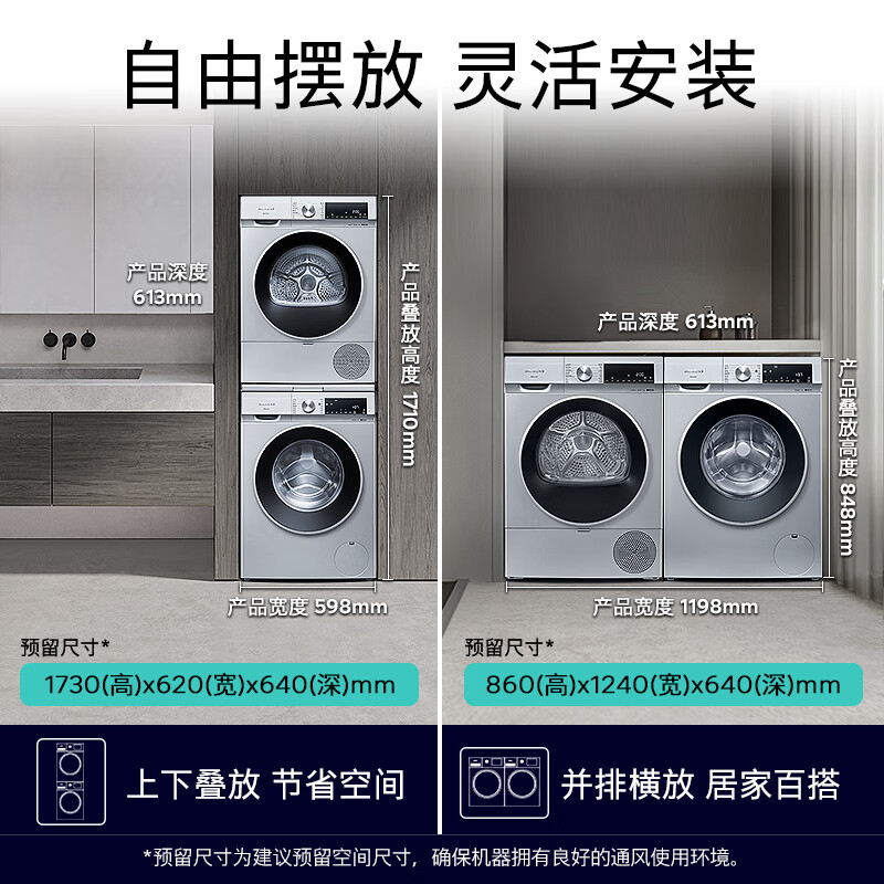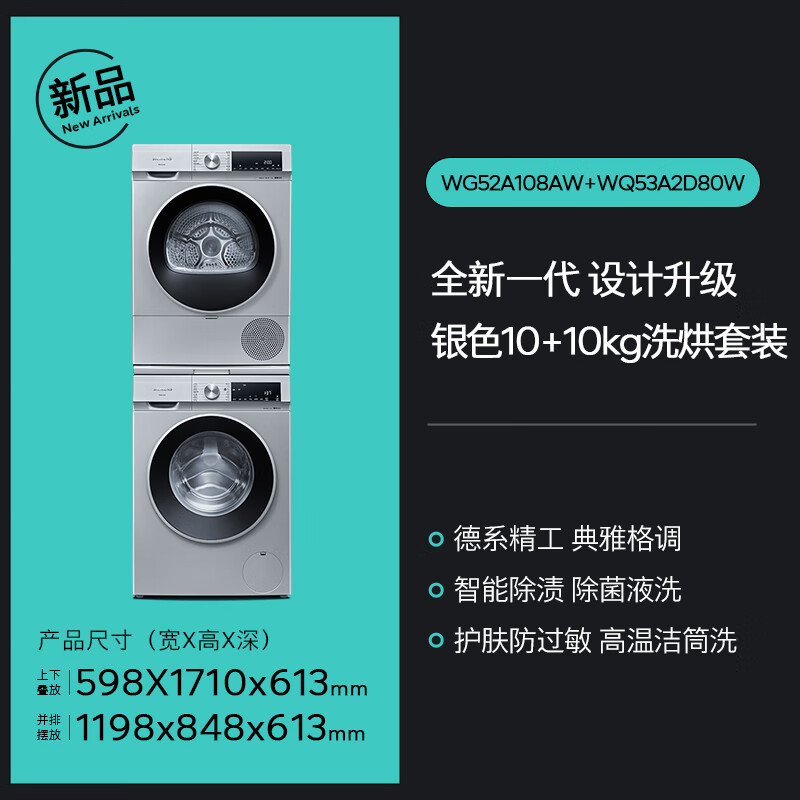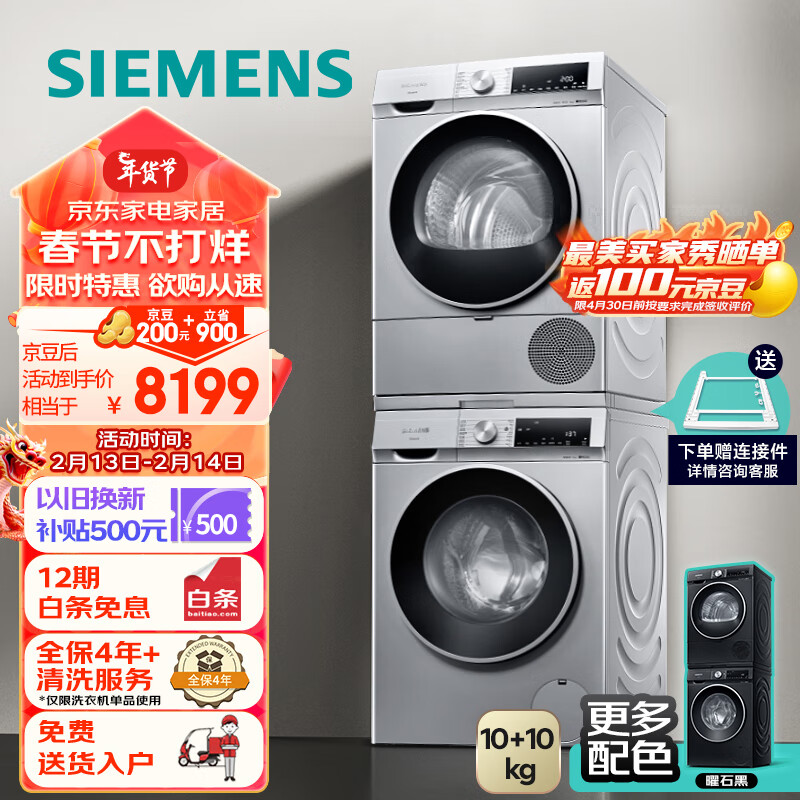 西门子(SIEMENS)iQ300洗烘套装 10kg 智能除渍 除螨 滚筒洗衣机全自动+10kg 羽绒服烘 热泵烘干机 108AW+D80W价格:9299.00元!