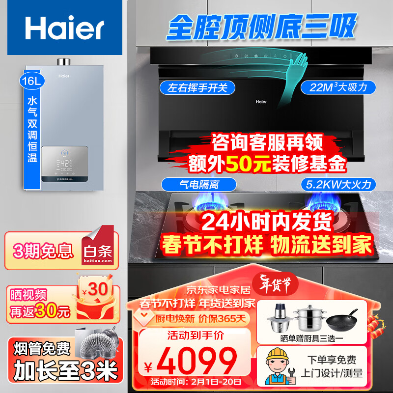 海尔(Haier)抽油烟机燃气灶套22m3挥手智控顶侧双吸EC710+5.2KW灶Q2BE50+16升下置风机热水器厨房三件套[家电]价格:4299.00元!