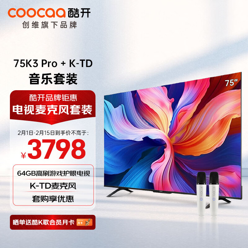 酷开创维 75英寸高刷电视机K3 Pro+K-TD麦克风套装 K歌电视 家庭KTV无线降噪话筒唱歌会议 双支麦克风价格:3798.00元!