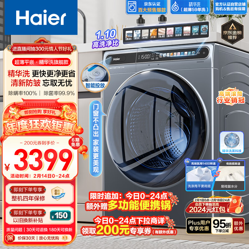 海尔(Haier)滚筒洗衣机全自动 精华洗59 1.1洗净比 10公斤大筒径 超薄彩屏 智能投放 以旧换新EG100MATESL59S价格:3599.00元!
