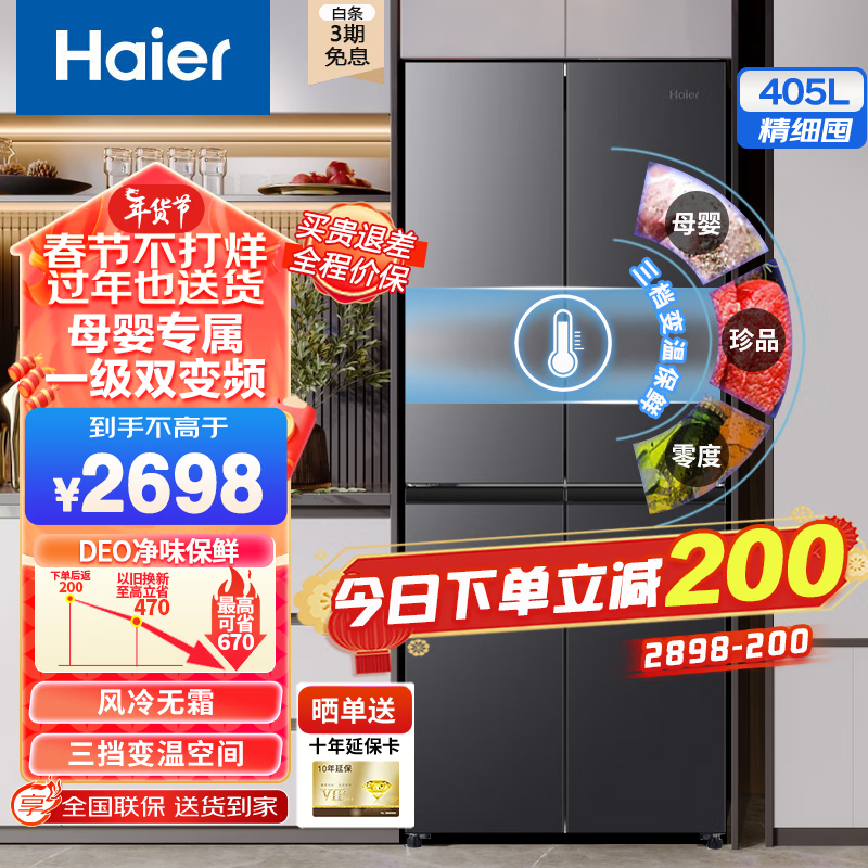 海尔(Haier)405升专属母婴空间冰箱十字对开门多门四门一级能效双变频风冷无霜电冰箱超薄机身智能双变频价格:2698.00元!