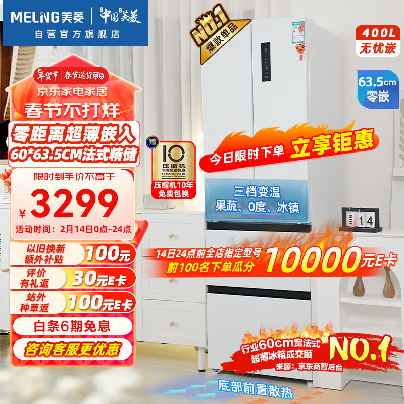 美菱(MeiLing)【无忧嵌】400升法式多门家用一级能效大容量风冷无霜冰箱超薄零嵌入式底部散热BCD-400WP9CZX白色价格:3099.00元!
