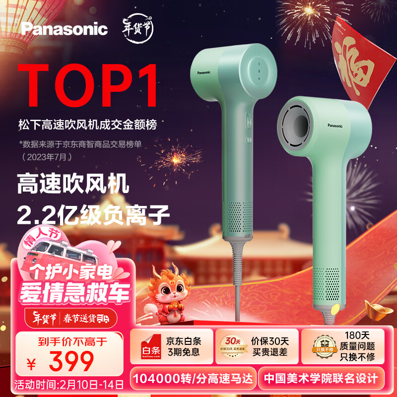松下(Panasonic)缤纷筒高速吹风机负离子低噪音大风力家用新年礼物电吹风速干护发家用大功率吹风筒NE7H莫奈绿价格:459.00元!