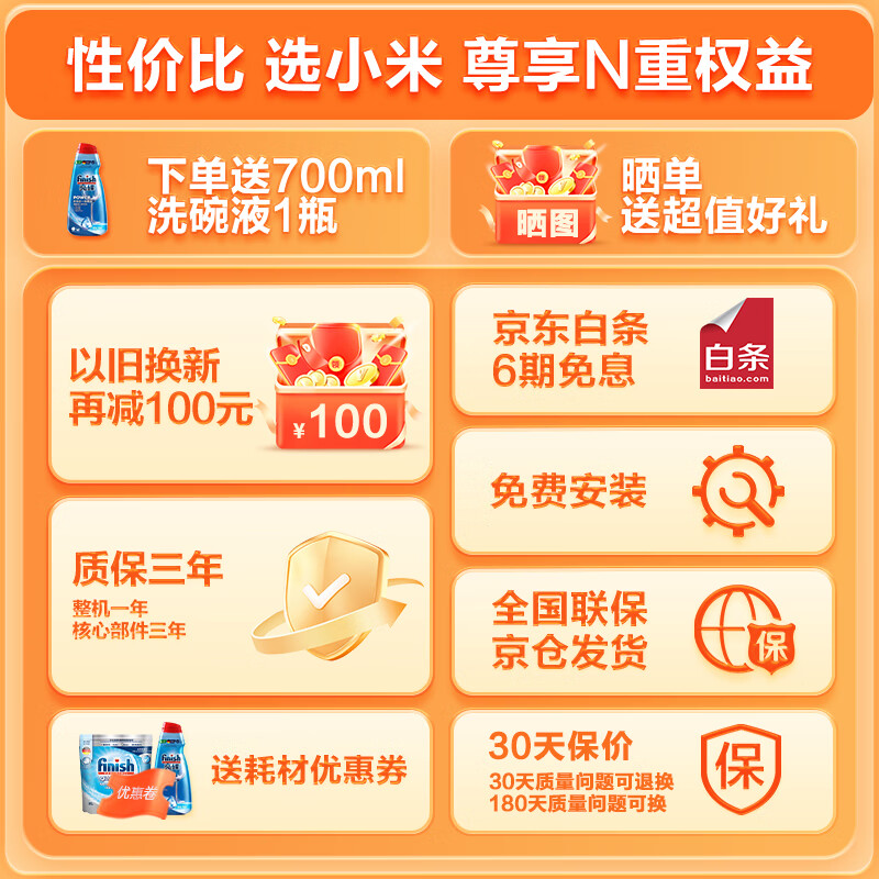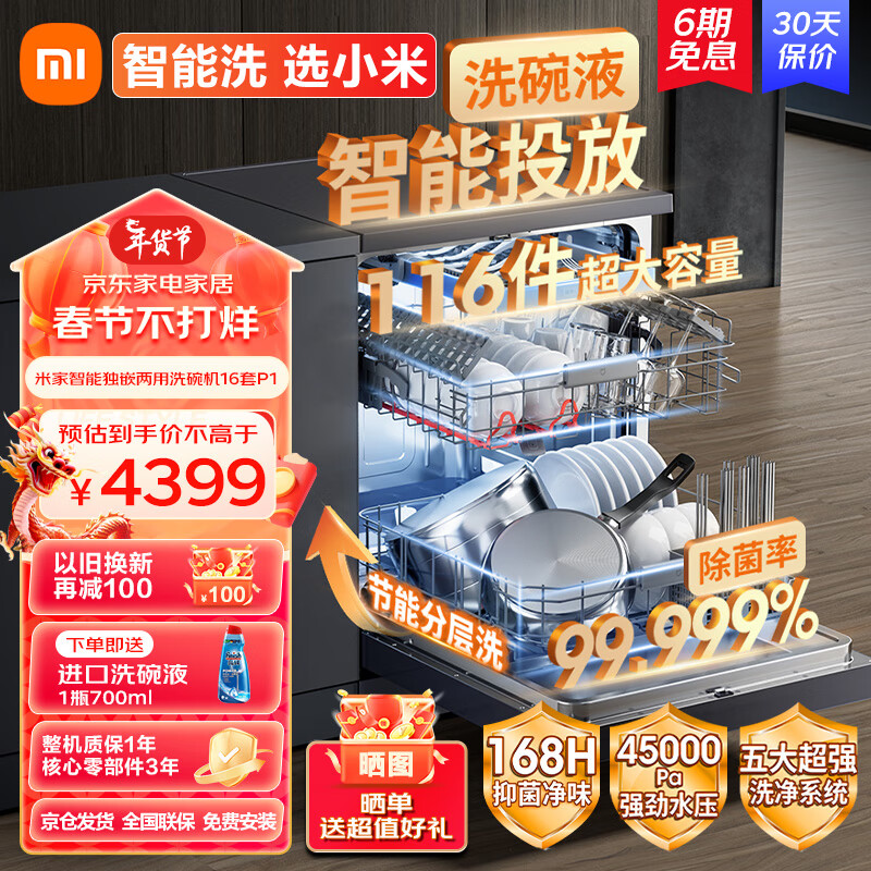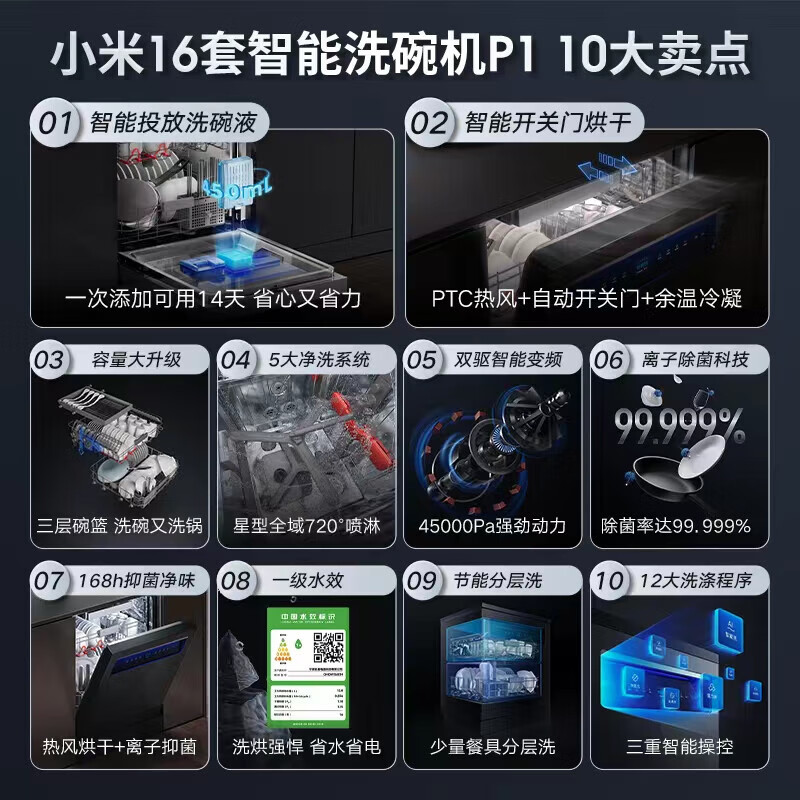 米家小米洗碗机 16套P1大容量嵌入式独嵌两用自动开关门烘干智能分层洗变频节水一级水效QMDW1601M价格:4399.00元!