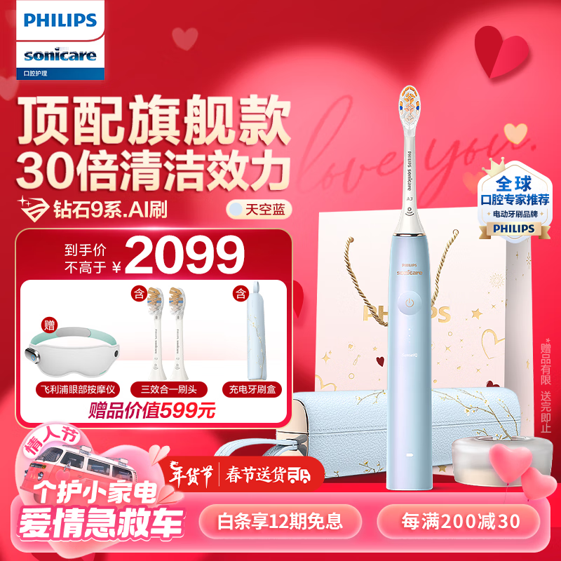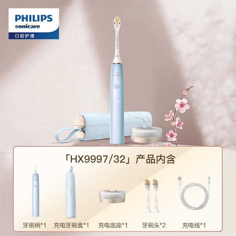 飞利浦(PHILIPS)电动牙刷情侣款新年 情人节礼物送女友/男友 新婚礼物 国风限定 20倍清除牙菌斑钻石9系AI刷天空蓝价格:2459.00元!