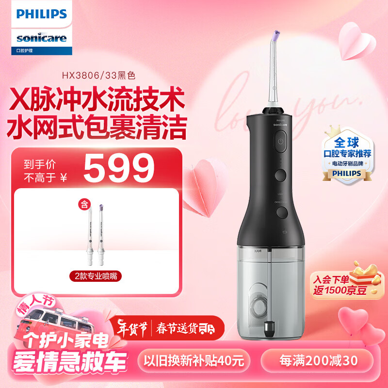 飞利浦家用立式冲牙器男/女立式手持2种洁齿模式3级洁齿力度美牙舱 HX3806/33黑色新年 情人节礼物价格:689.00元!