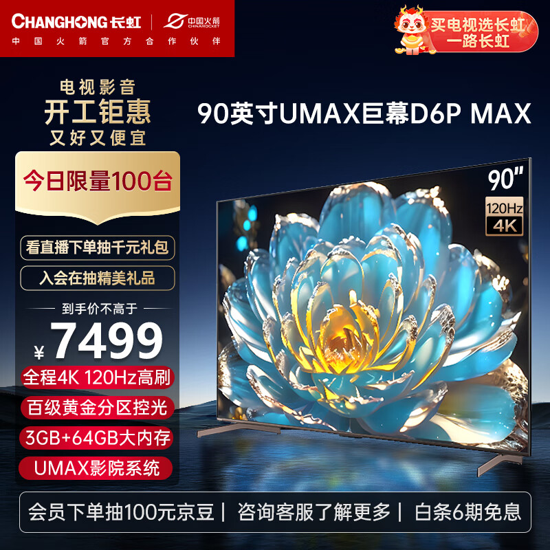 长虹电视90D6P MAX 90英寸 4K120Hz 3+64GB大内存 UMAX影院系统液晶LED电视机价格:7499.00元!