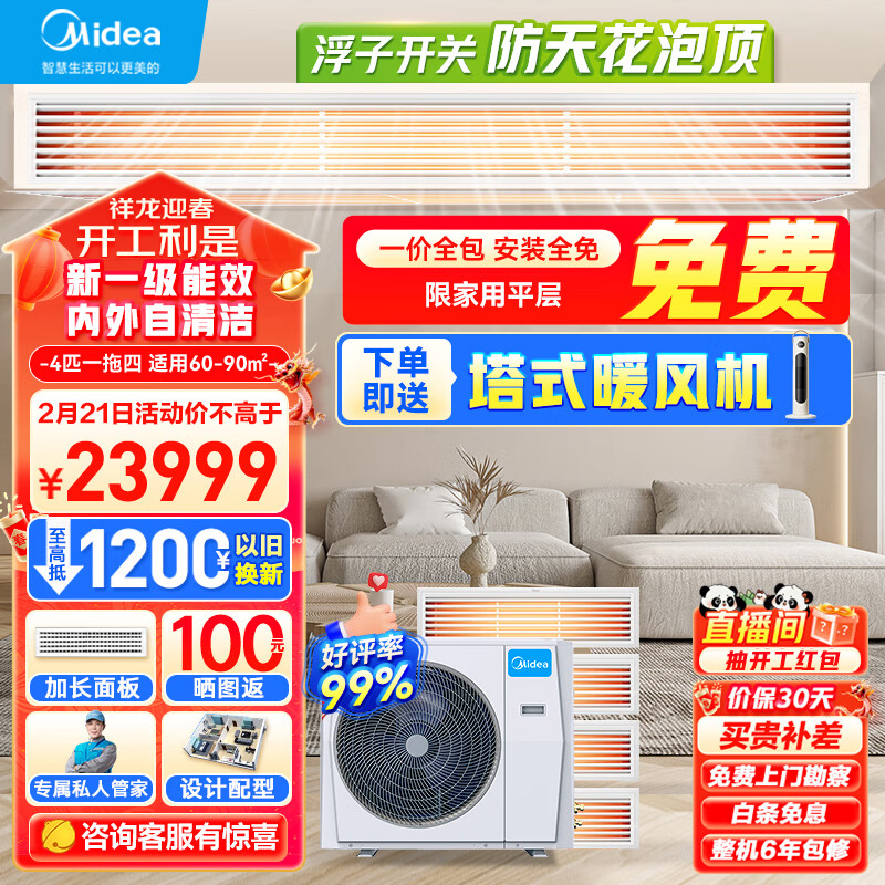 美的(Midea)中央空调一拖四风管机4匹星光多联机新一级能效全直流变频冷暖清洁嵌入式MDS-H100W-A(1)Ⅲ价格:24099.00元!