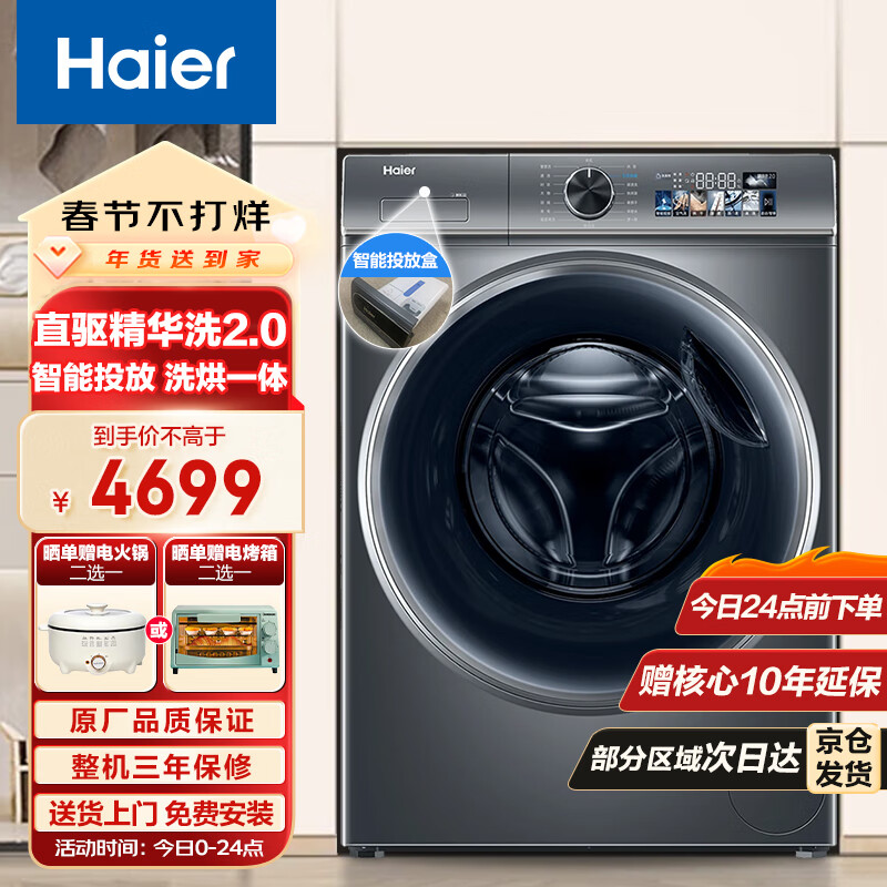 海尔(Haier)【精华洗2.0】10KG直驱变频滚筒洗衣机全自动一级能效智能投放除菌空气洗烘一体机XQG100-HBD1266价格:4699.00元!
