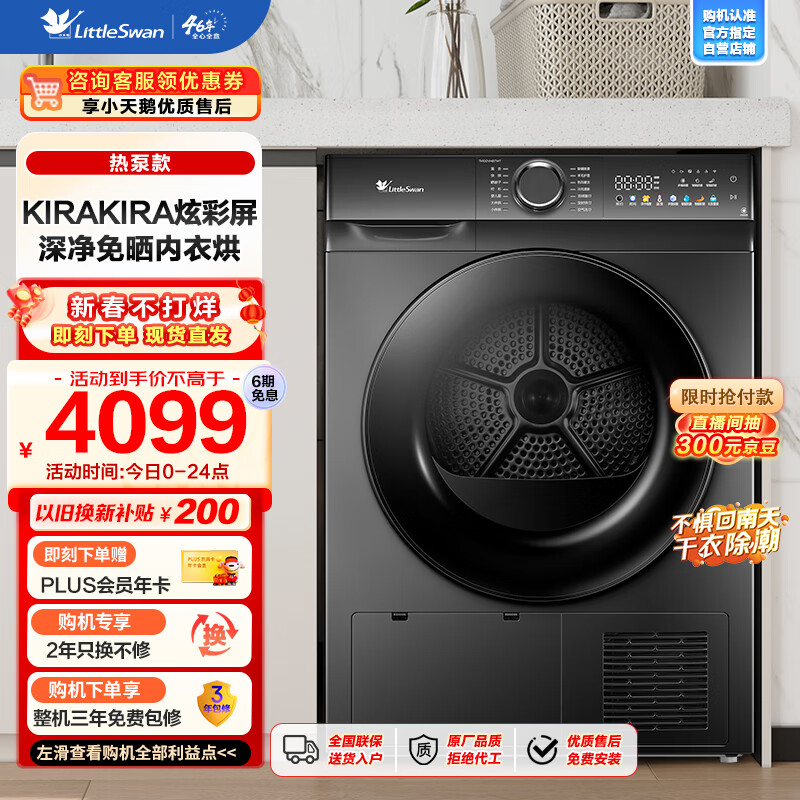 小天鹅(LittleSwan)热泵烘干机家用 全自动干衣机 10公斤大容量 多维除菌除螨 毛屑过滤 晒被子 TH100VH617WT价格:4099.00元!