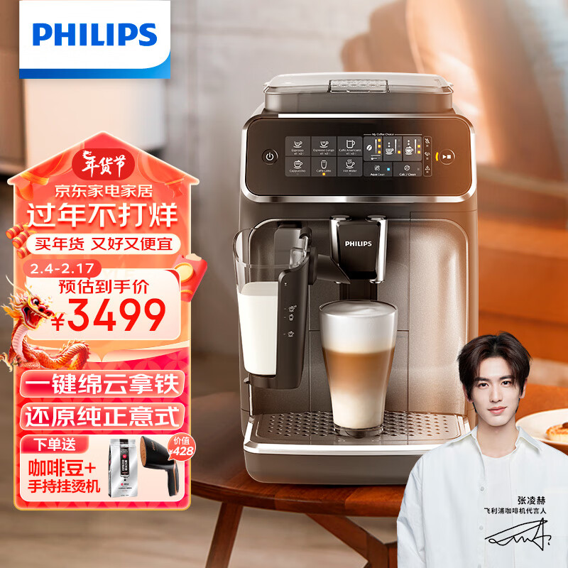 飞利浦(PHILIPS)云朵咖啡机3系EP3146/82 家用/办公室意式浓缩萃取全自动研磨一体机奶泡现磨咖啡豆系统价格:3499.00元!