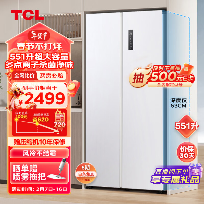 TCL 551升大容量对开双开门两门冰箱630mm超薄可嵌入除菌净味一级能效风冷无霜家用电冰箱R551T5-S价格:2499.00元!