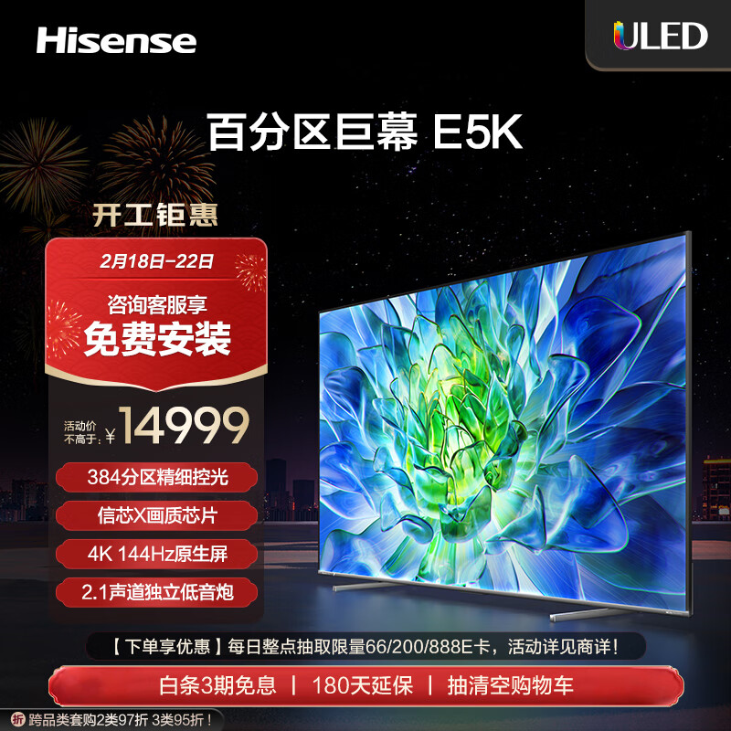 海信电视100E5K 100英寸ULED 384分区 4+128GB 4K 144Hz智能液晶平板电视机 以旧换新 98英寸+价格:14999.00元!