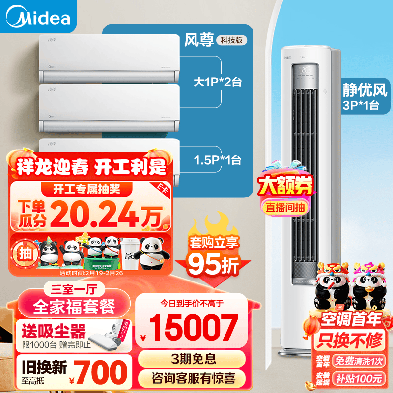 美的(Midea)空调 风尊静优风系列 全家福套餐 三室一厅(大1匹风尊科技版*2+1.5匹风尊科技版+3匹静优风柜机)价格:15796.00元!