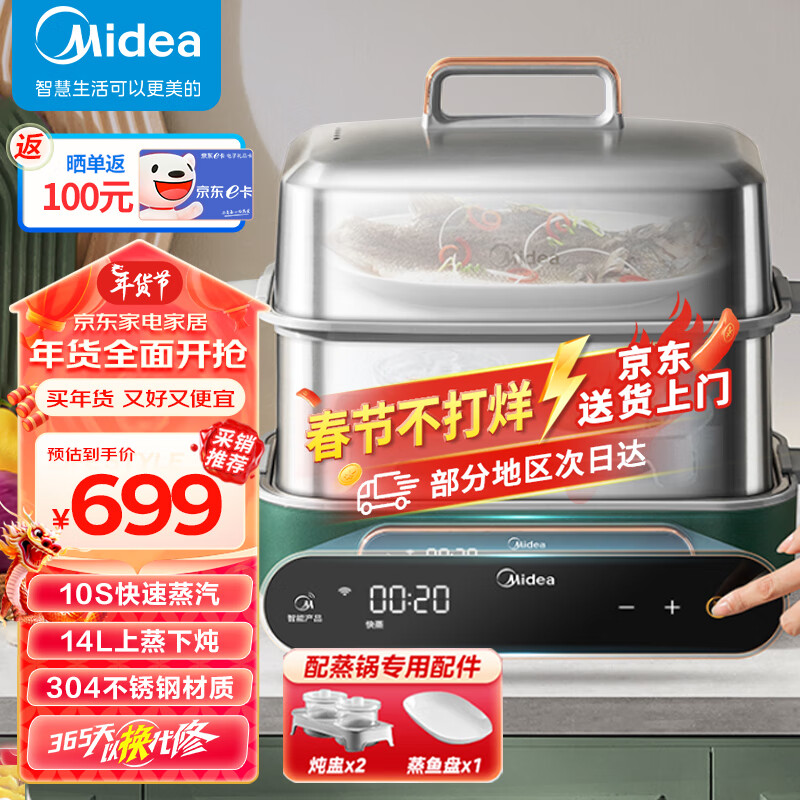美的(Midea) 锁嫩舱电蒸锅 蒸炖锅14L 隔水炖 智能蒸汽烹饪智能云操作家用多用途锅ZGS352002价格:699.00元!