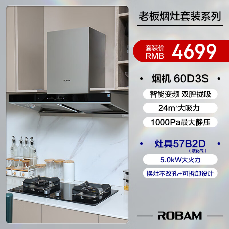 老板(Robam)抽油烟机D3S欧式顶吸双腔变频24大风量家用燃气灶吸油烟机灶具套装60D3S套装(液化气)价格:4699.00元!