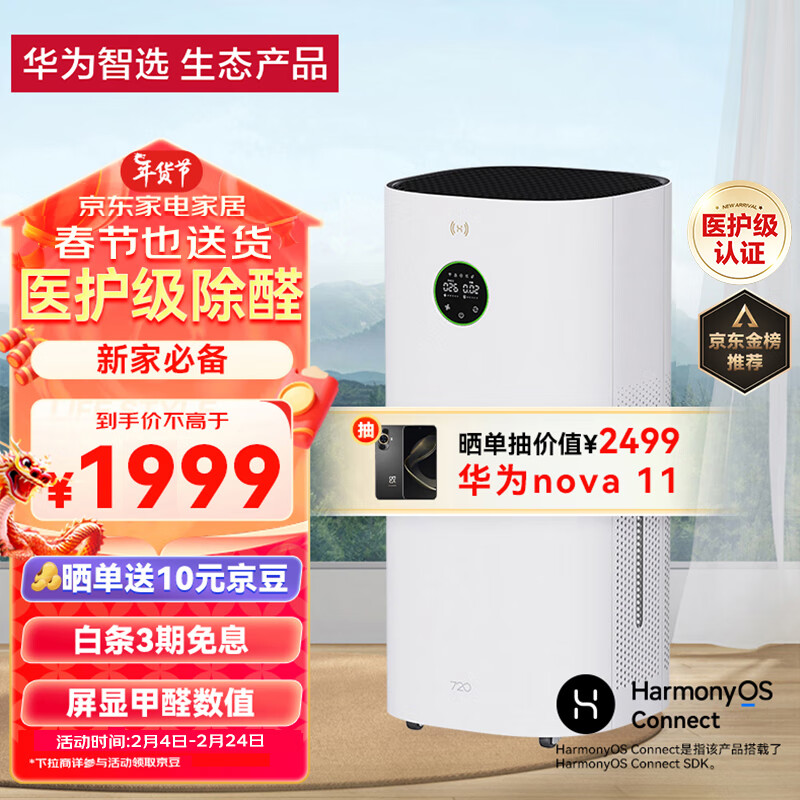 华为智选720空气净化器3 真分解式除甲醛 除菌除异味 除过敏原 智能甲醛PM2.5双数显 装修家用大空间价格:1899.00元!