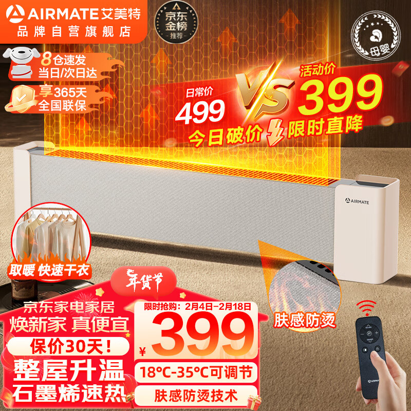艾美特(AIRMATE)【日光温室】取暖器/电暖器/电暖气片家用石墨烯地暖母婴级肤感防烫踢脚线 【石墨烯速热+肤感防烫遥控款】母婴级专用R37价格:499.00元!