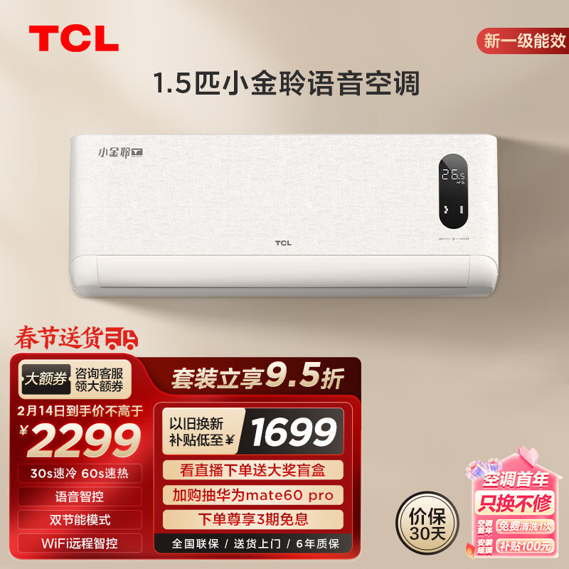 TCL空调1.5匹新一级能效变频冷暖 小金聆T7G 智慧语音 壁挂式卧室空调挂机KFR-35GW/RT7Ga+B1以旧换新价格:2299.00元!