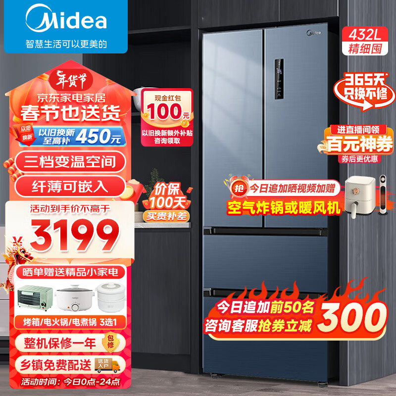 美的(Midea)432升法式多门四开门冰箱 家用双变频一级能效智能电冰箱 (402升级款)BCD-432WFPZM(E)价格:3498.00元!