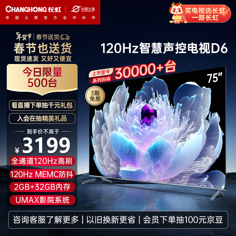 长虹电视75D6 75英寸120Hz高刷免遥控语音杜比视界 2+32GB MEMC四大投屏 4K平板液晶LED电视机以旧换新价格:3099.00元!