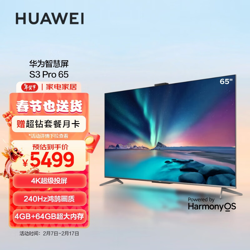 华为智慧屏 S3 Pro 65英寸 4K超级投屏240Hz超高清屏 智能液晶游戏超薄护眼大内存电视机HD65AJMS价格:5499.00元!