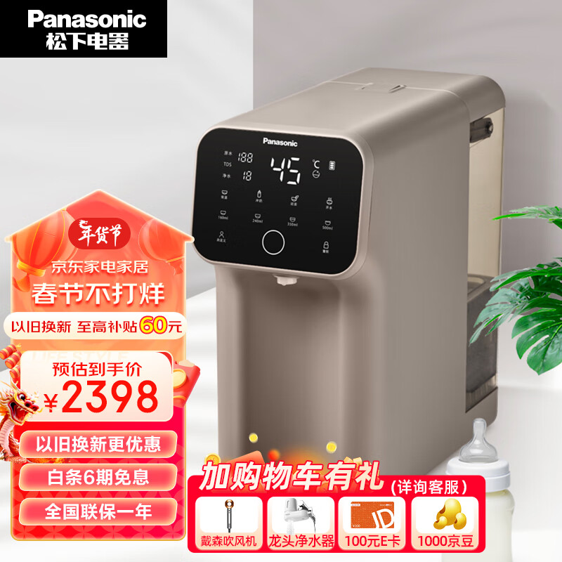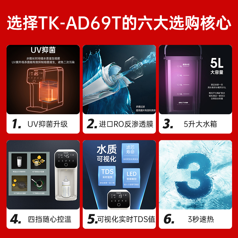 松下 Panasonic 加热净水器净饮一体机UV消毒家用直饮机台式即热式RO反渗透净水机饮水机TK-AD69T价格:2398.00元!