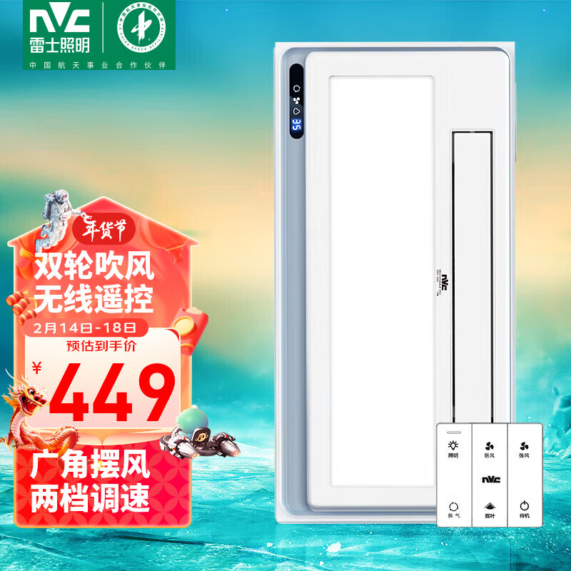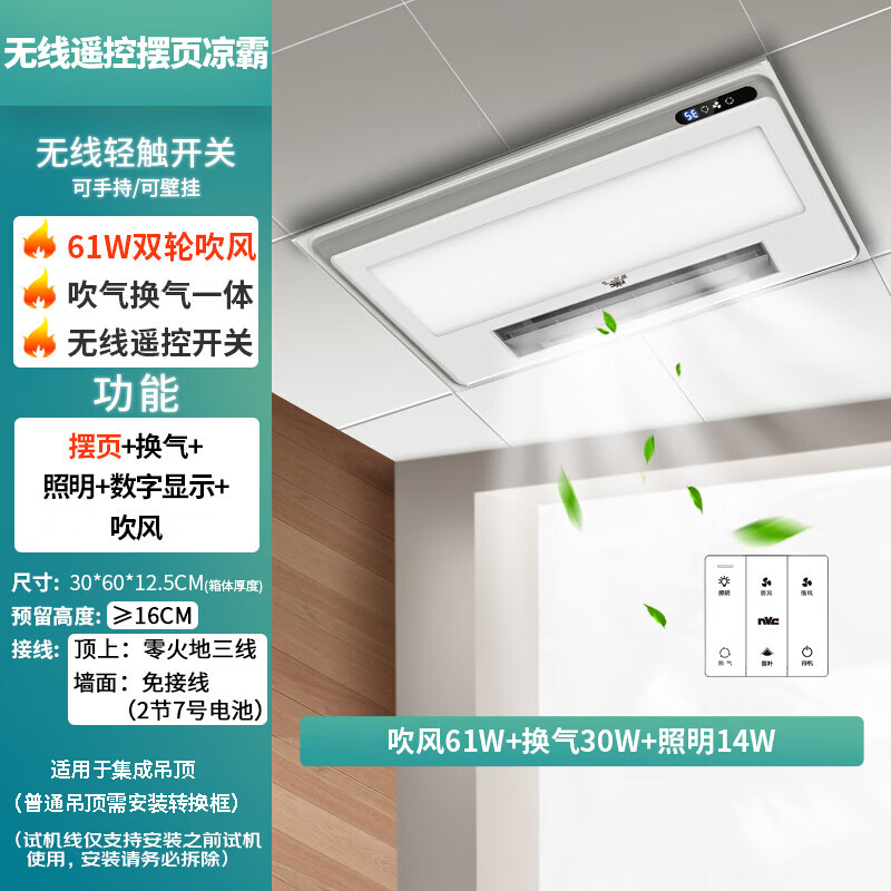 雷士(NVC)厨房凉霸冷风机卫生间集成吊顶换气照明一体无线遥控摆叶吹风扇价格:689.00元!