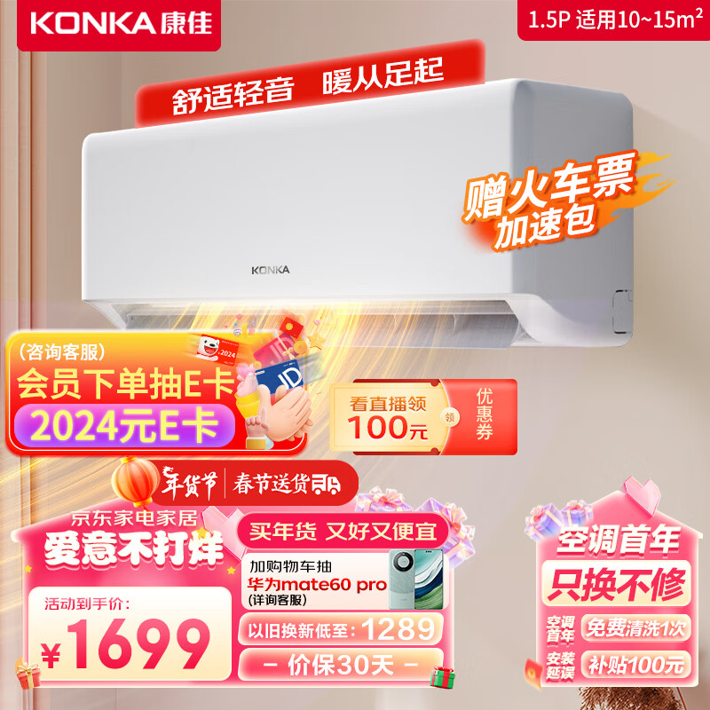 康佳(KONKA)1.5匹 新能效 快速冷暖 一键节能 变频壁挂式空调挂机 以旧换新 KFR-35GW/Y3价格:1699.00元!