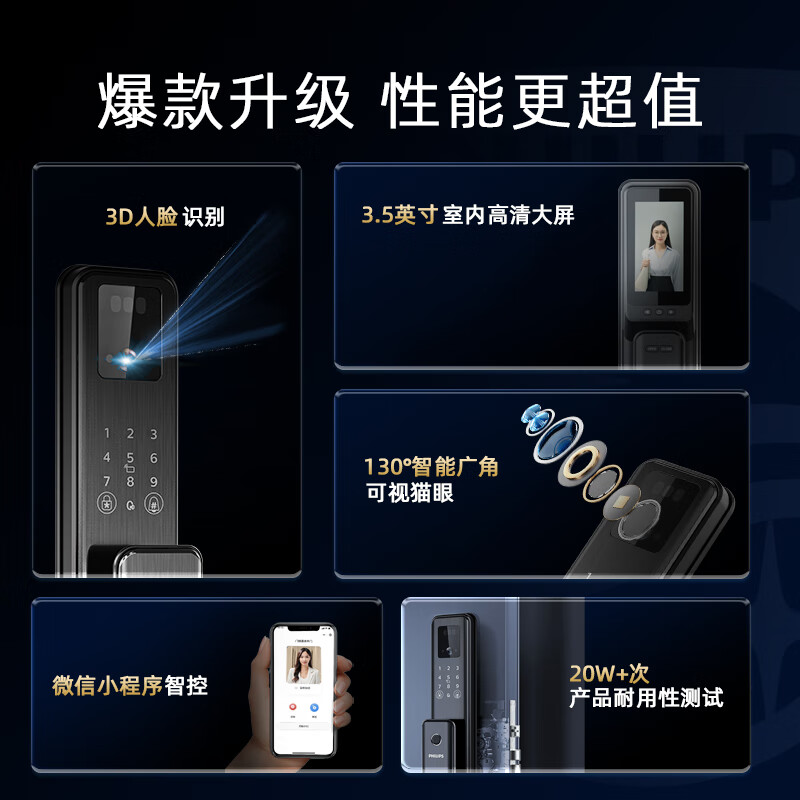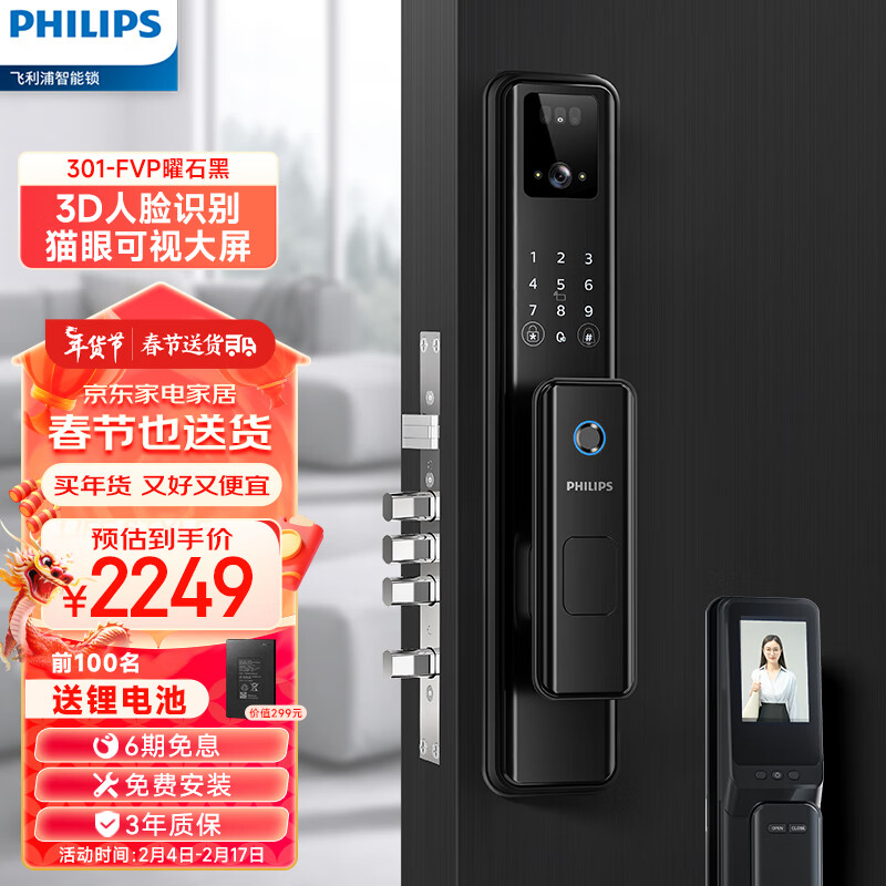 飞利浦(PHILIPS)智能锁301 智能门锁 指纹锁 密码锁防盗门锁WIFI智联按门铃抓拍 301FVP-曜石黑(人脸+大屏猫眼)价格:4099.00元!