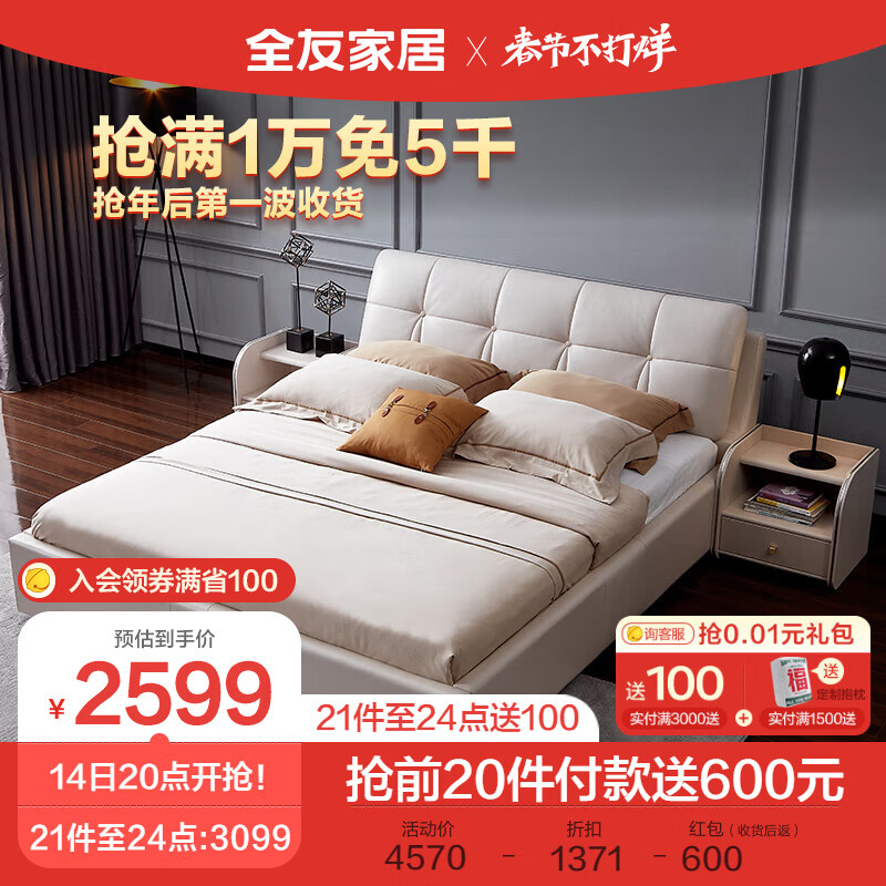 全友家居 床简约风皮床双人床卧室家具头层牛皮1.8米婚床大床105135价格:4570.00元!