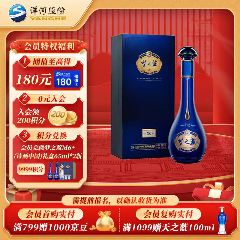 洋河 梦之蓝M6+ 52度 550ml 单瓶装 绵柔浓香型价格:928.00元!