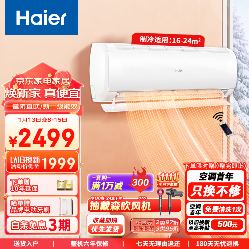 海尔(Haier)新一级能效1.5匹变频空调 光感APP智控快速冷暖自清洁大风量卧室壁挂式空调挂机防直吹 以旧换新价格:2499.00元!