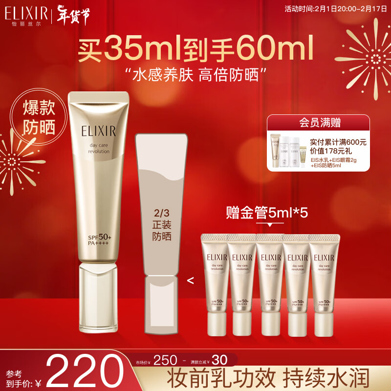 怡丽丝尔抗光老金管防晒霜35ml SPF50+保湿隔离二合一通勤出游情人节礼物价格:220.00元!