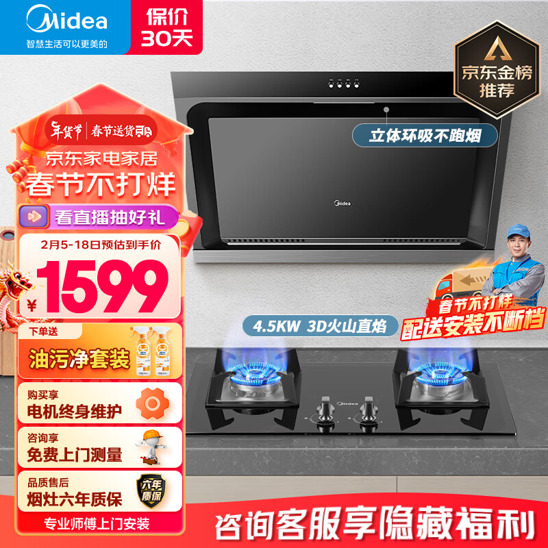 美的(Midea)侧吸式家用抽油烟机 燃气灶具烟灶套装 多重油烟分离技术 立体环吸J30+Q217A天然气价格:1599.00元!