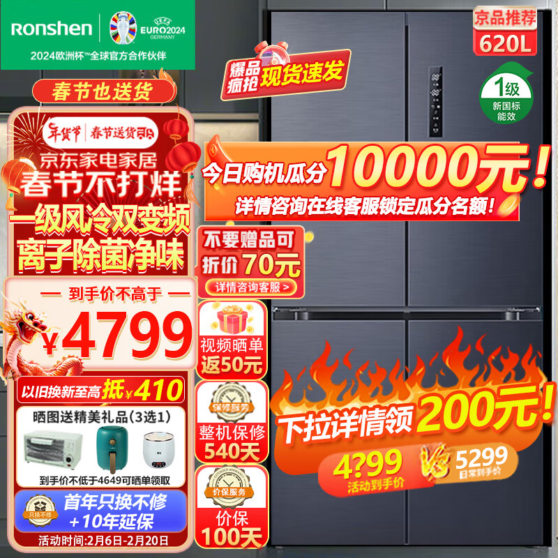 容声(Ronshen)【水蓝光系列】620升冰箱四开门十字对开门家用一级能效变频风冷除菌净味全生态养鲜BCD-620WD19FP价格:4799.00元!