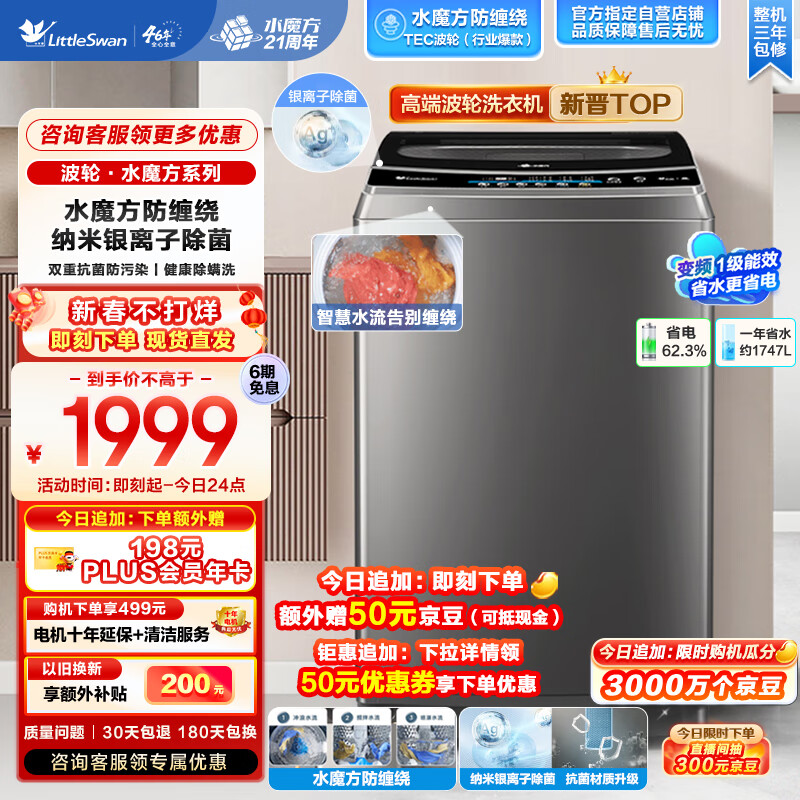 小天鹅(LittleSwan)波轮洗衣机全自动 水魔方系列 【TB100TEC】 变频防缠绕 健康除菌螨 直驱 以旧换新 10公斤价格:1999.00元!