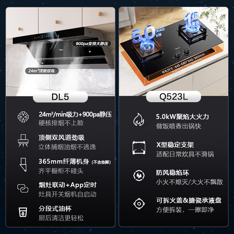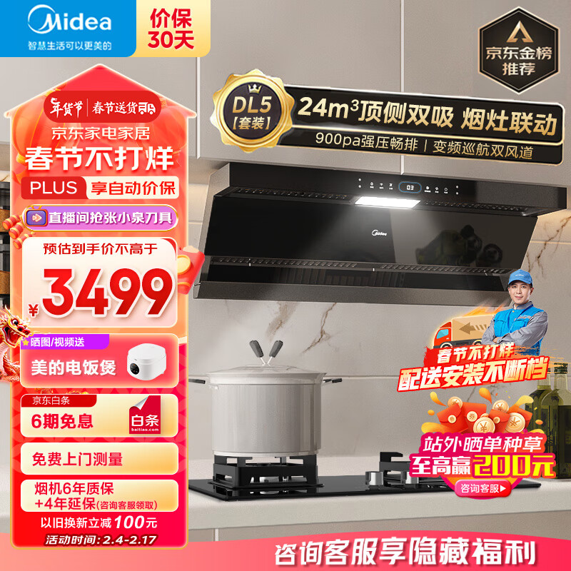 美的(Midea)抽油烟机燃气灶具家用顶侧双吸烟灶联动智控变频24风量大吸力超薄近吸烟灶套装DL5+Q523L天然气价格:3499.00元!