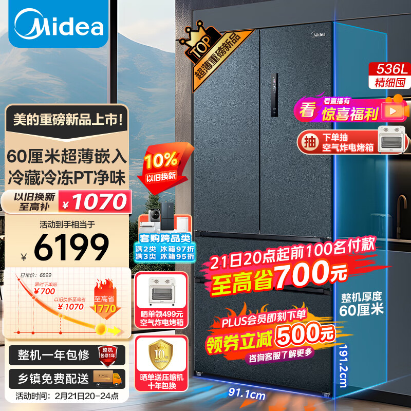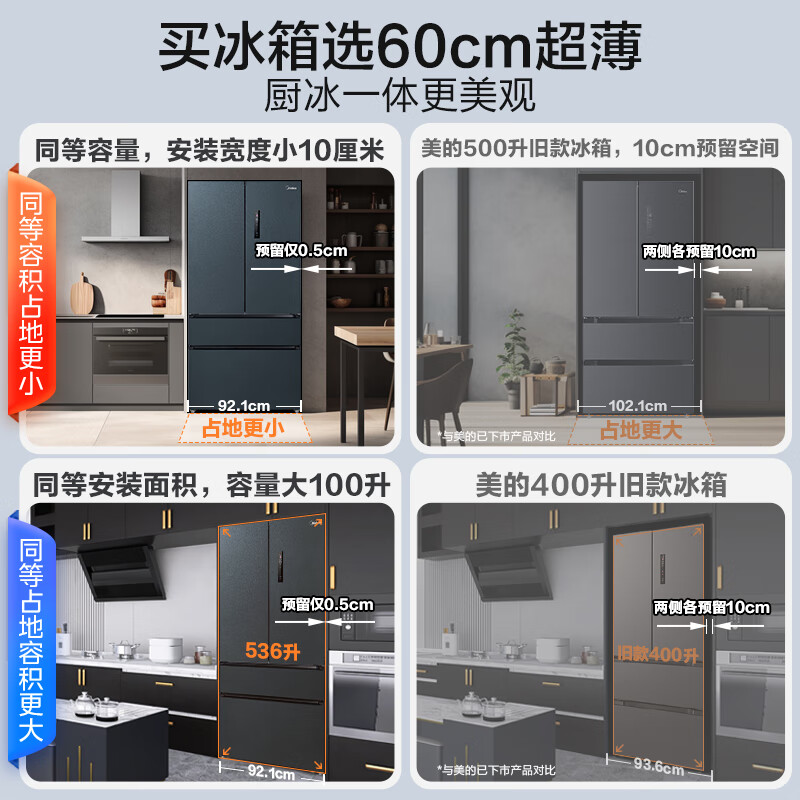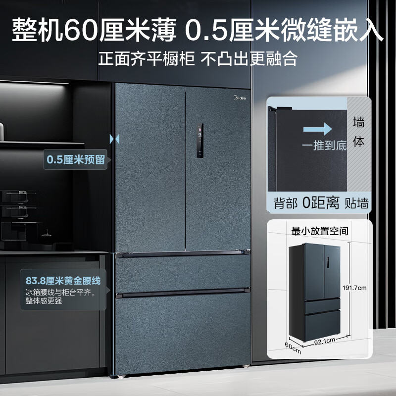 美的(Midea)60cm薄嵌562法式多门四开门一级变频风冷无霜大容量超薄零嵌入式家用电冰箱智能MR-562WUFPZE价格:7399.00元!