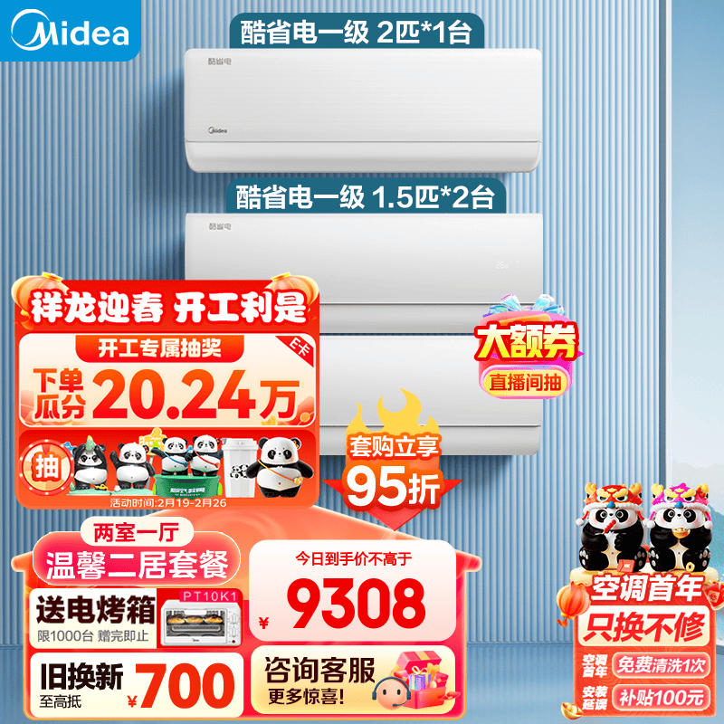 美的(Midea)酷省电空调系列温馨两居套餐(1.5匹酷省电*2+2匹酷省电)一站购齐套购价格:9797.00元!