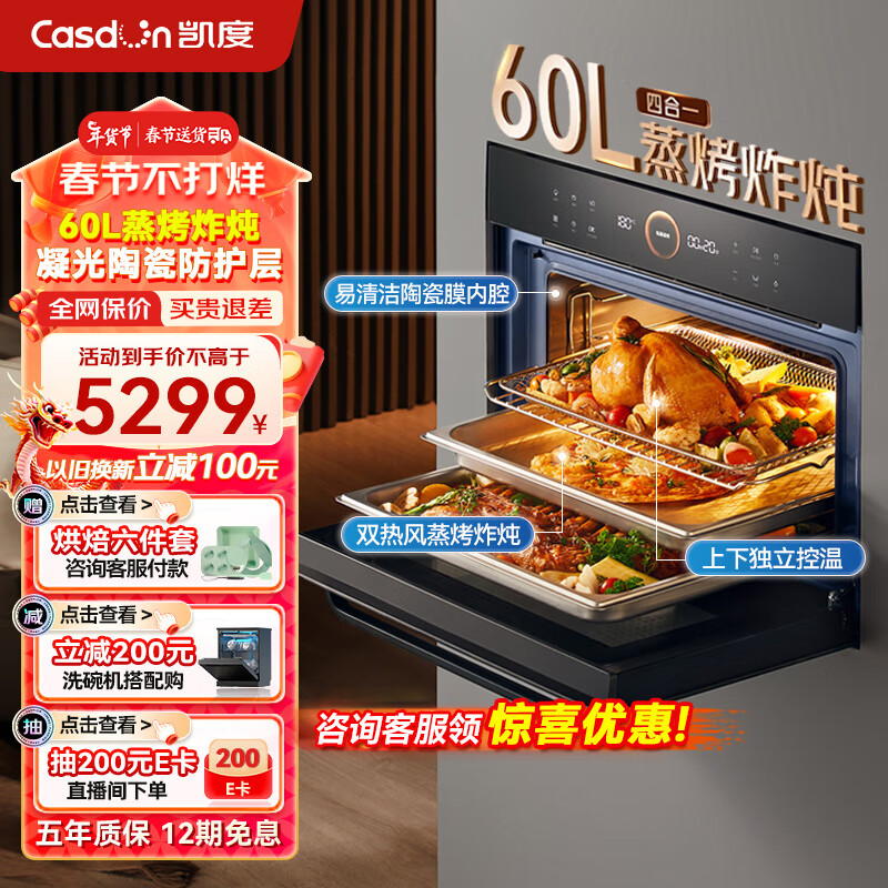 凯度(CASDON)60L蒸烤箱一体机嵌入式 双热风 多功能蒸箱烤箱 蒸烤炸炖四合一SR6028FE22-TD Pro二代价格:5299.00元!