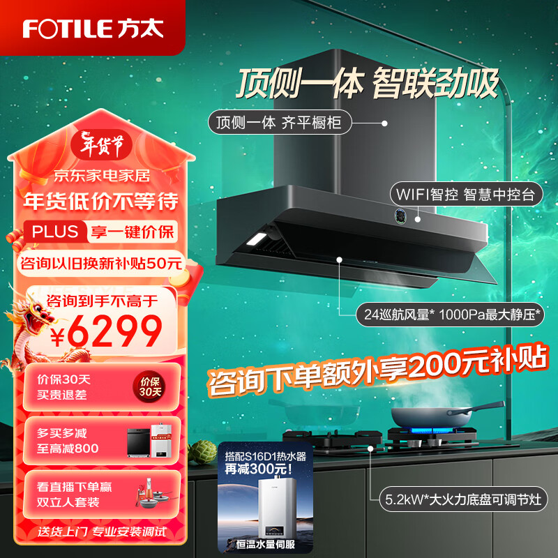 方太(FOTILE)F2抽吸油烟机灶具套装 顶侧一体欧式侧吸 变频烟灶24巡航风量5.2kW套餐01-F2.i+02-TH27B天然气价格:6299.00元!