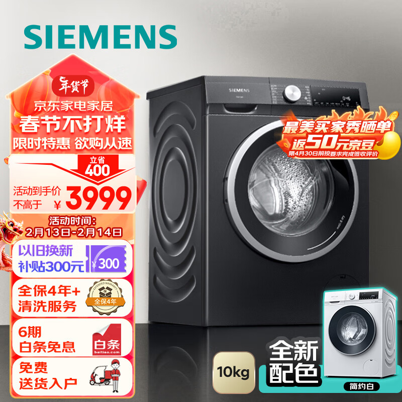 西门子(SIEMENS)iQ300曜石黑系列 10公斤滚筒全自动洗衣机烘干机一体机 专业除菌护衣 智能羽绒服洗烘 U24W价格:4399.00元!