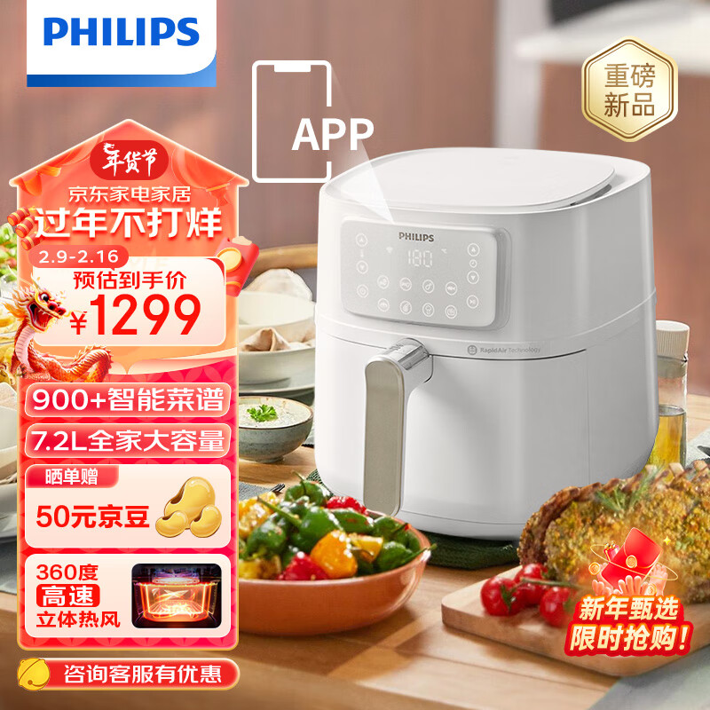 飞利浦(PHILIPS)全新智控空气炸锅 7.2L大容量智能烹饪 精准控温不用翻面 APP菜谱多功能烤箱一体HD9285价格:1299.00元!